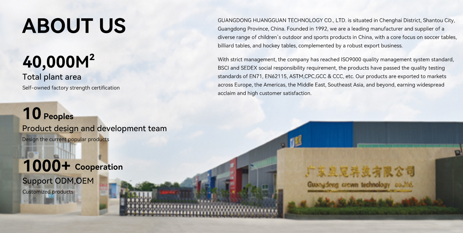GUANGDONG HUANGGUAN TECHNOLOGY CO., LTD. is situated in Chenghai District, Shantou City, Guangdong Province, China. Founded in 1992, we are a leading manufacturer and supplier of a diverse range of children’s outdoor and sports products in China, with a core focus on soccer tables, billiard tables, and hockey tables, complemented by a robust export business.