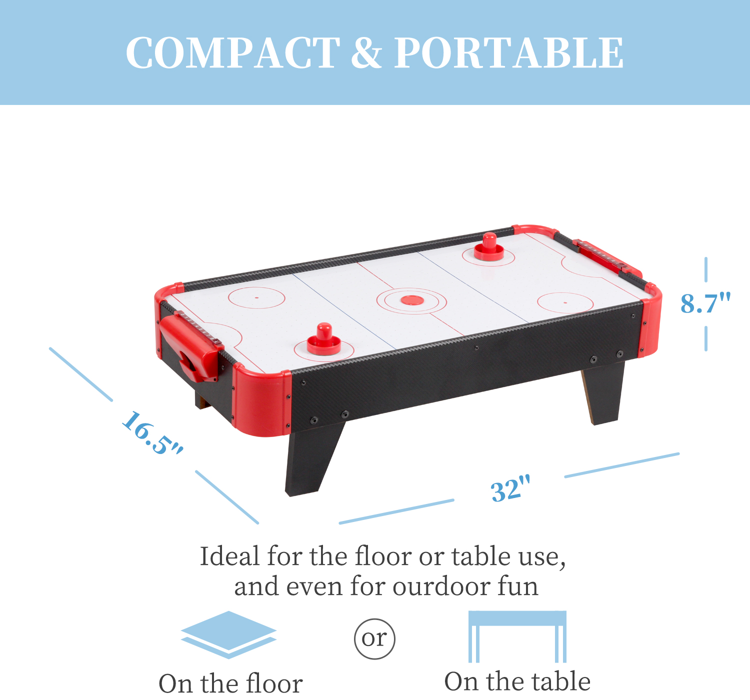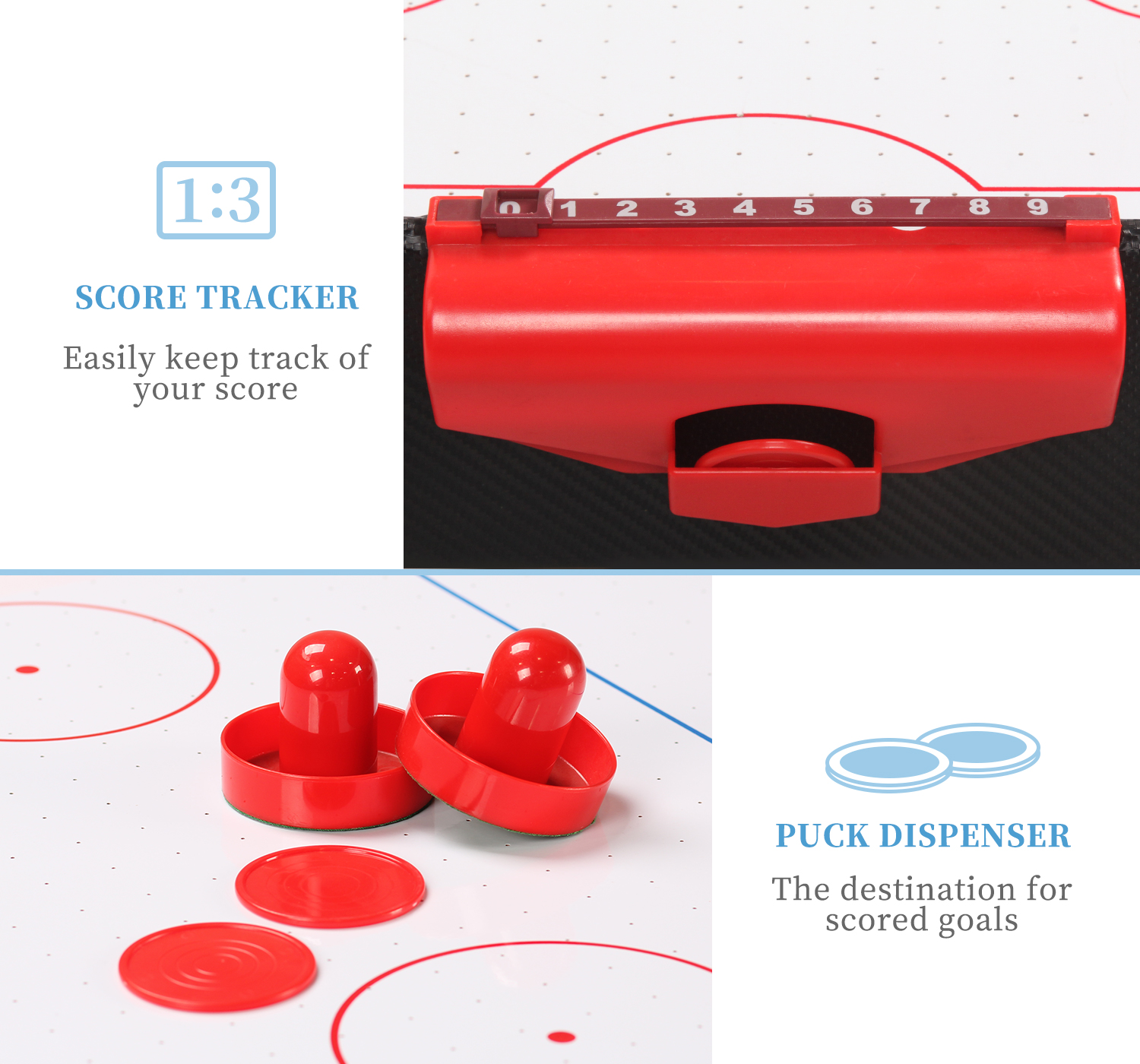Everything you need: the electric-powered air table comes with all the pieces you need for a challenging game of table top Hockey. With two Scoreboard options, 2 mini pucks, and 2 mini pushers, you have all the accessories you need. Don’t hesitate to buy it!