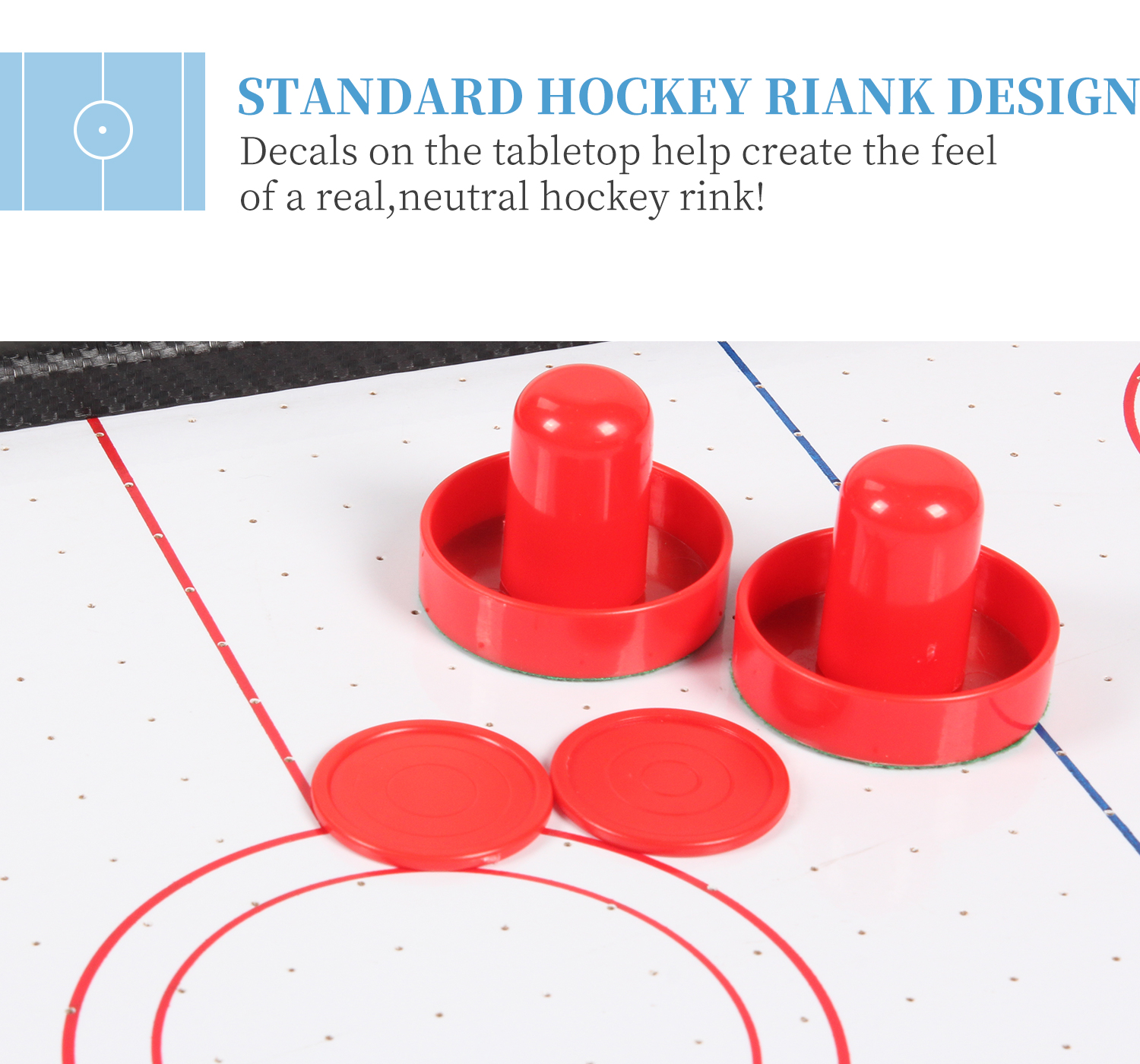 Play the hockey game using pushers and hover pucks Constructed from durable MDF, metal and PVC to ensure it last through many uses Kids and adults can get lots of enjoyment from this versatile and simple-to-use interactive furniture It will fit in nicely in a game room, garage or playroom.